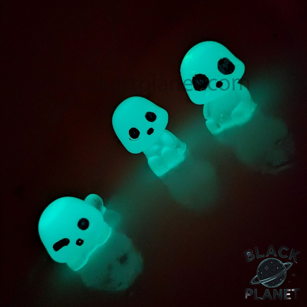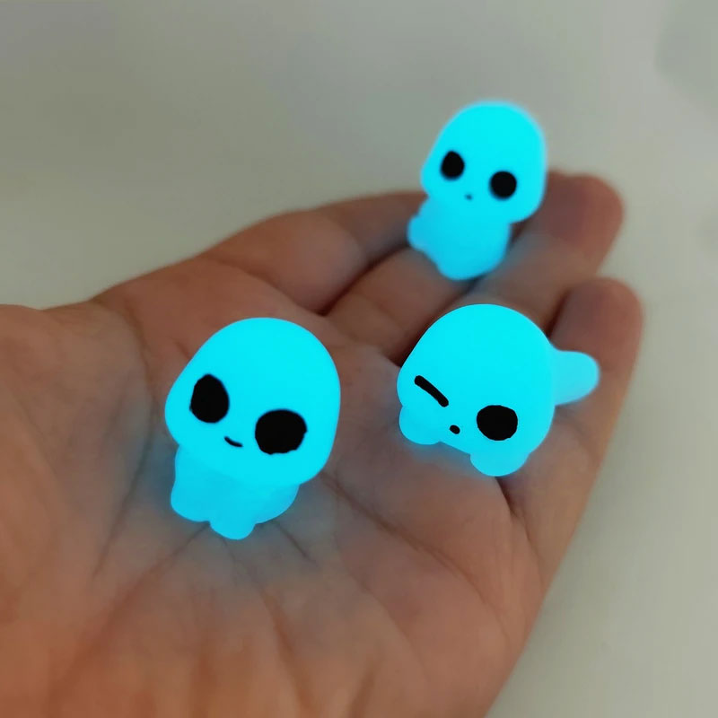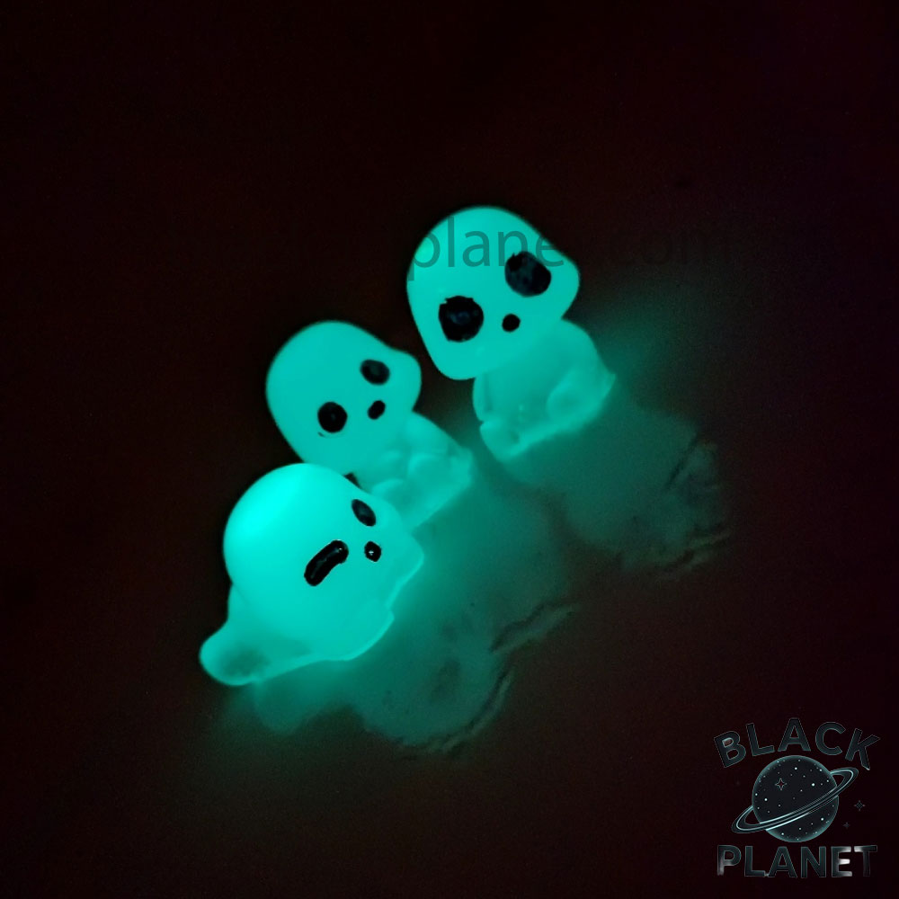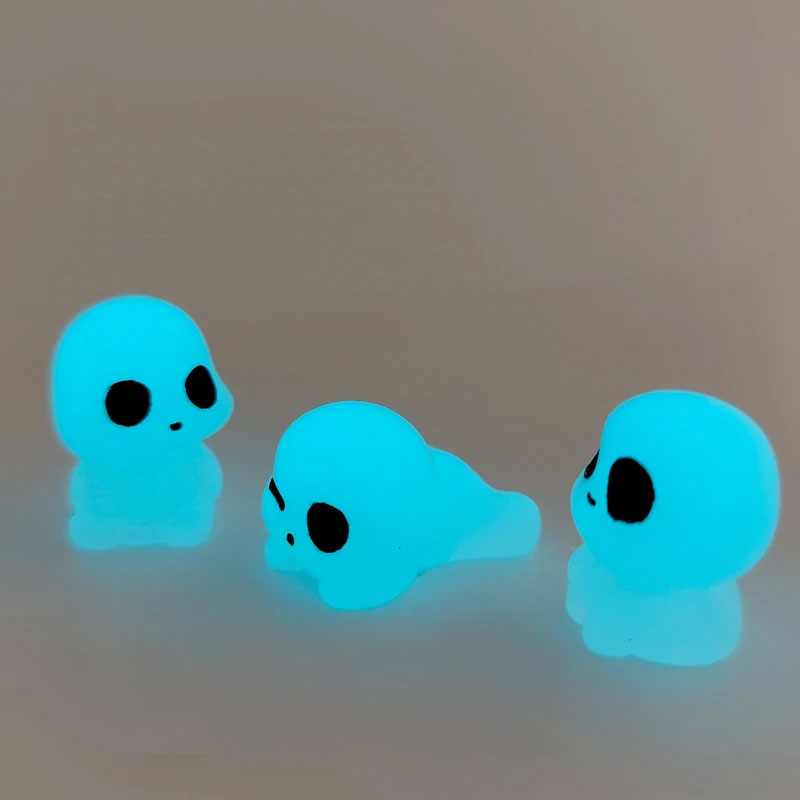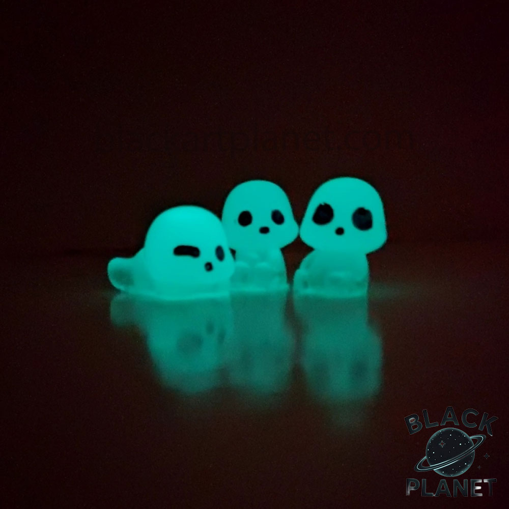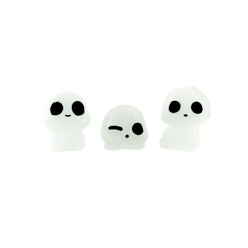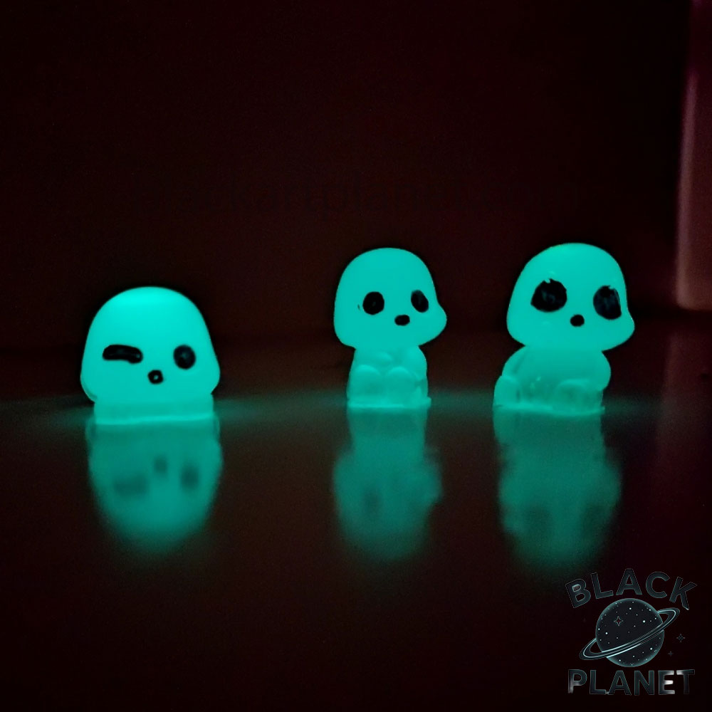 مجسمه شب تاب ارواح بسته سه عددی با حدودا قد 4 الی 5 سانتی متر و نور شب تاب فیروزه ای . در ابتدا با فلش گوشی بهش نور بتابانید و در تاریکی از خودش نور ساتع میکند