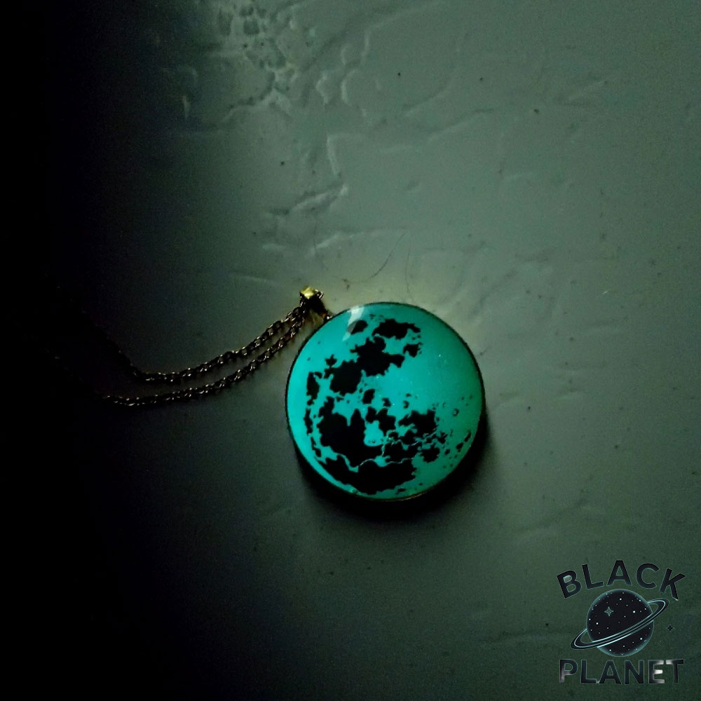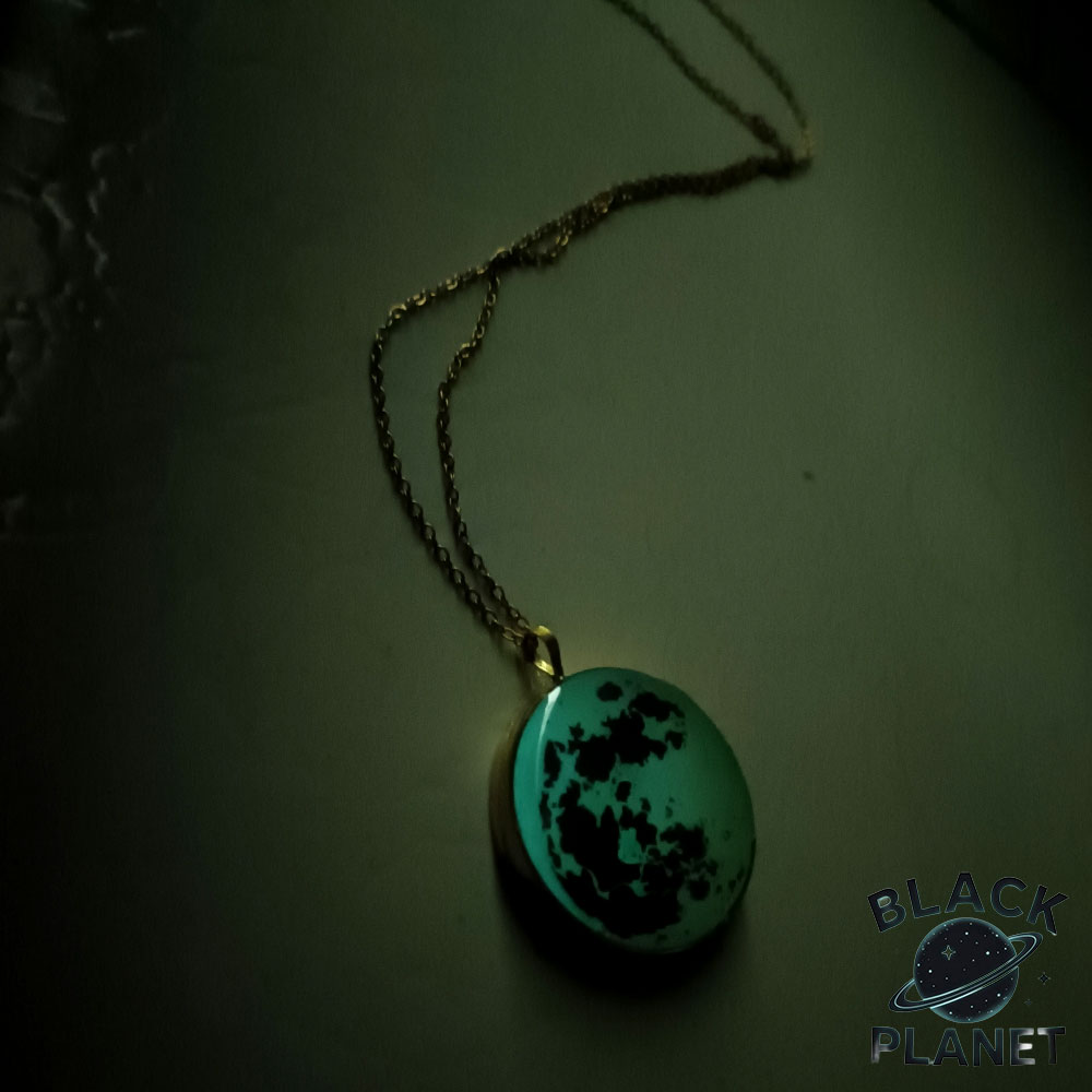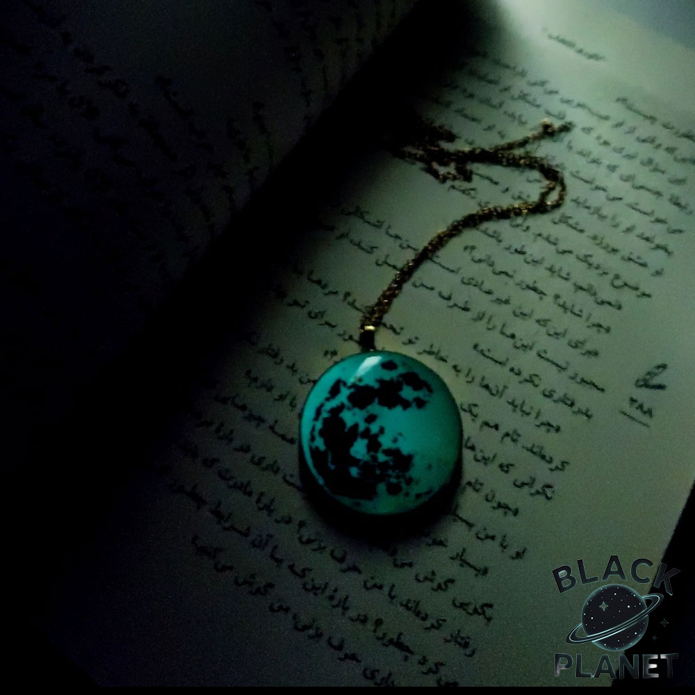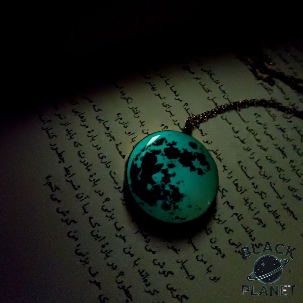 گردنبند ماه شب تاب سایز بزرگ فیروزه ای دارای قطر دایره سانتی متری می باشد .